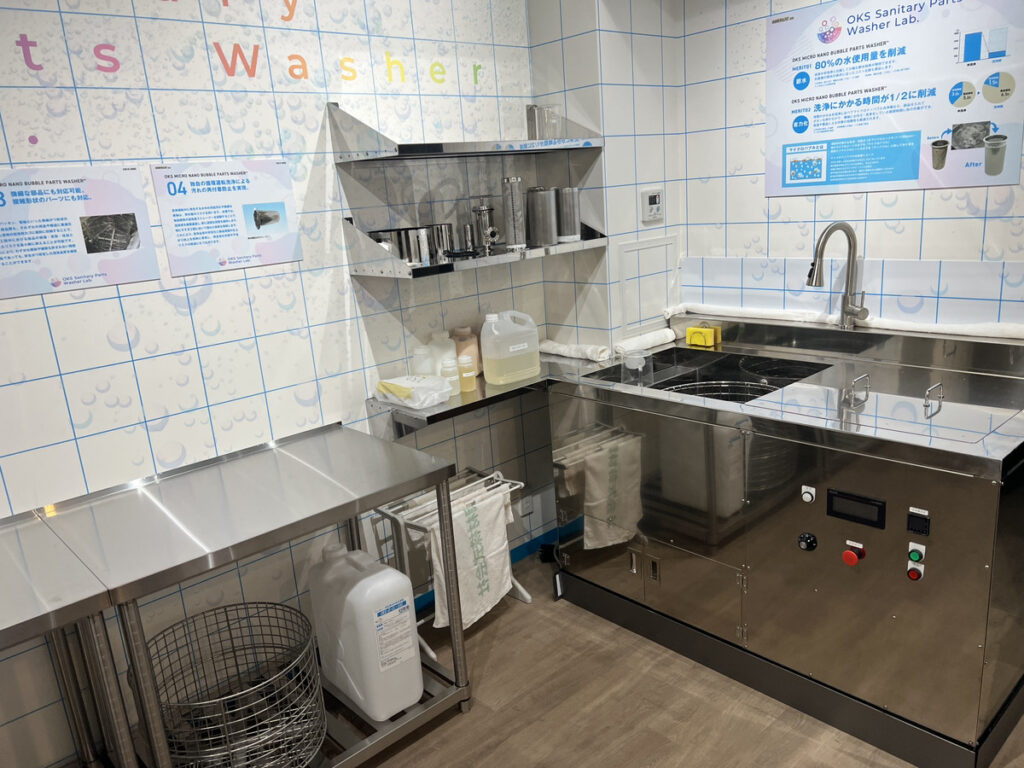 こちらの洗浄機は、株式会社奥谷金網製作所様の本社隣に開設されたサニタリー事業部のラボ「OKSサニタリー部品洗浄ラボ」にて、ご覧いただくことができます。